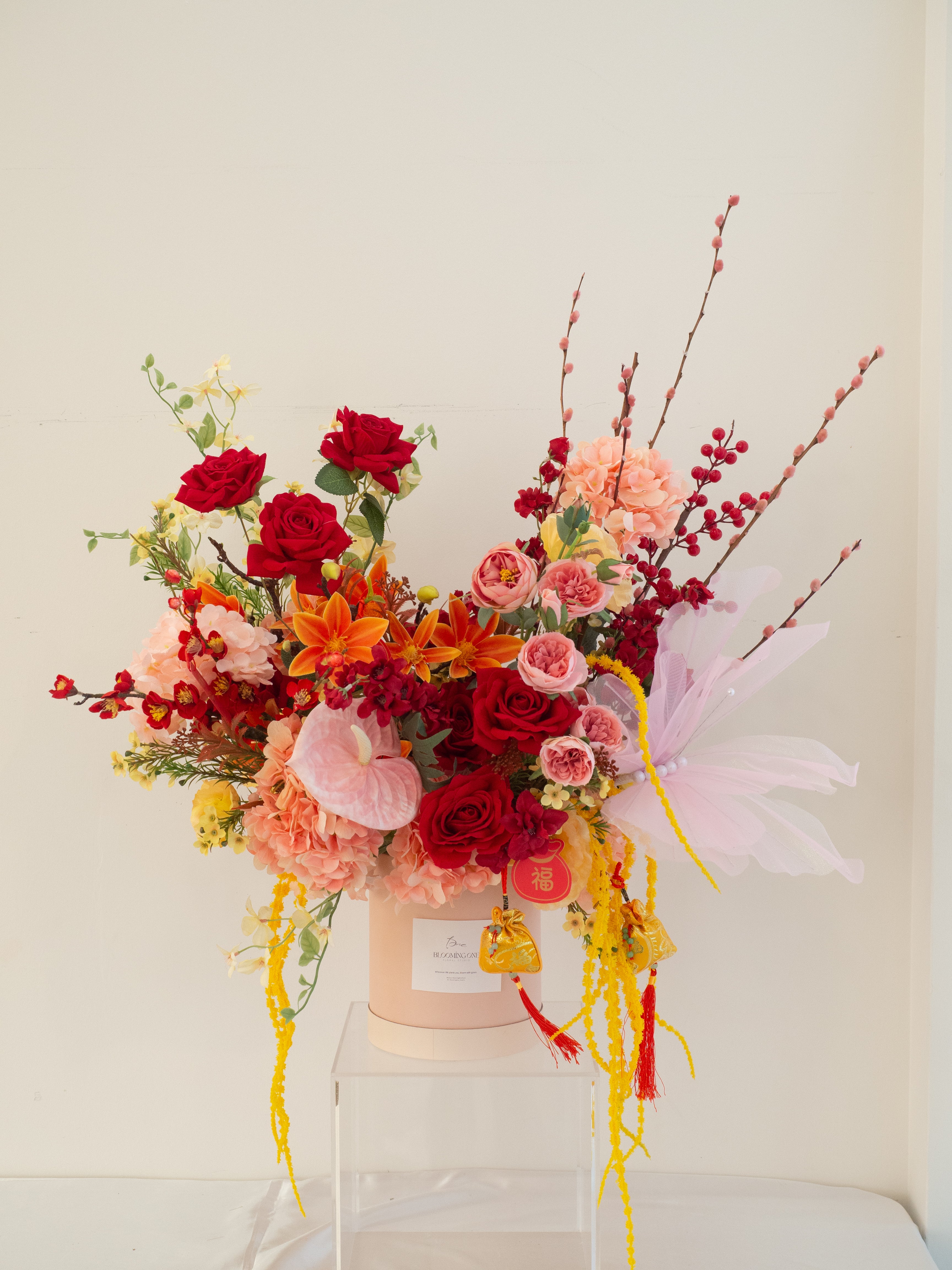 Celebrate Lunar New Year with our Prosperous Petals floral box — a vibrant mix of red roses, orchids, hydrangeas, and golden accessories symbolizing wealth, health, and happiness. Adorned with handcrafted tassels and festive charms, it’s the perfect gift for family, friends, or corporate blessings.