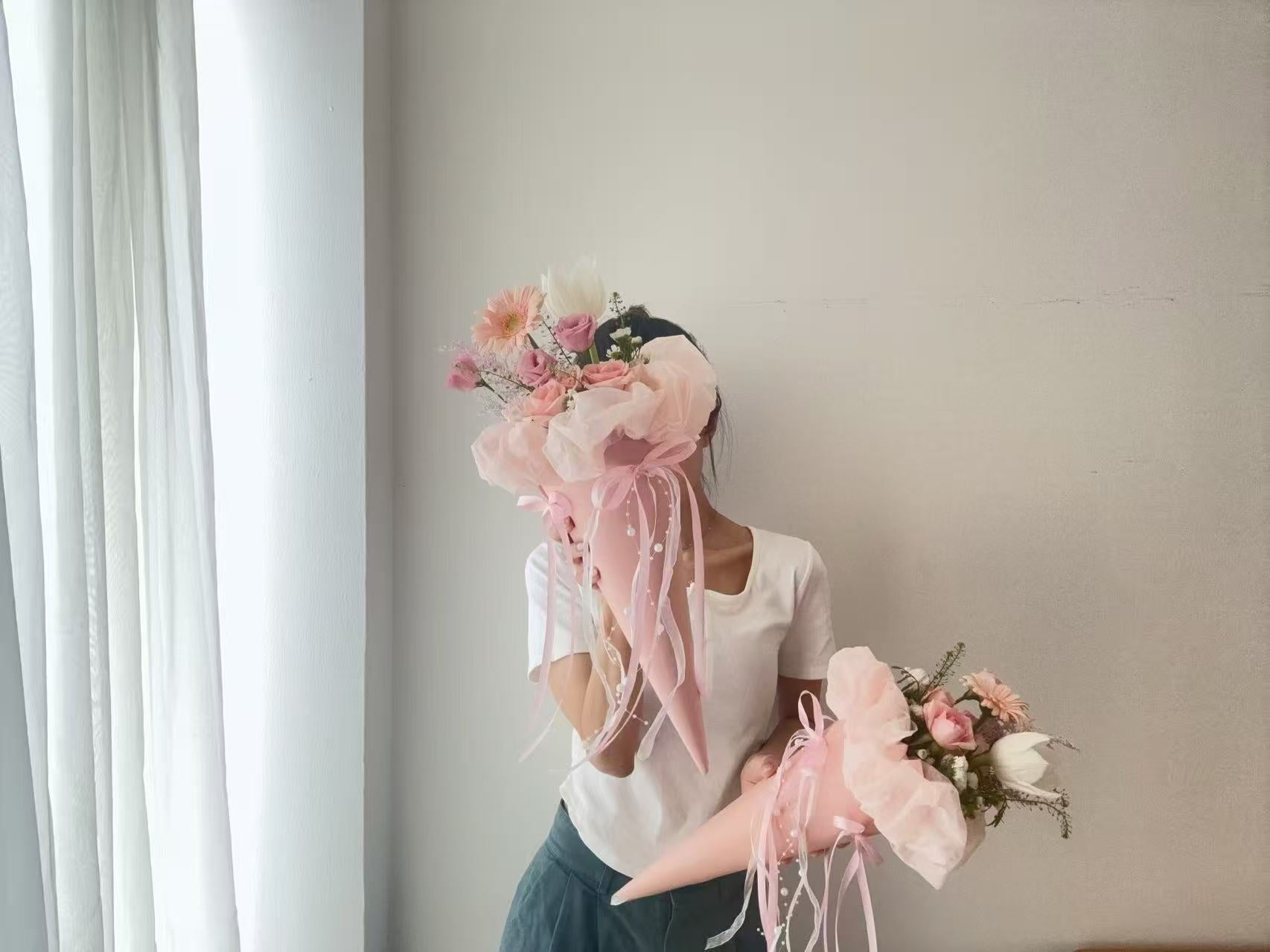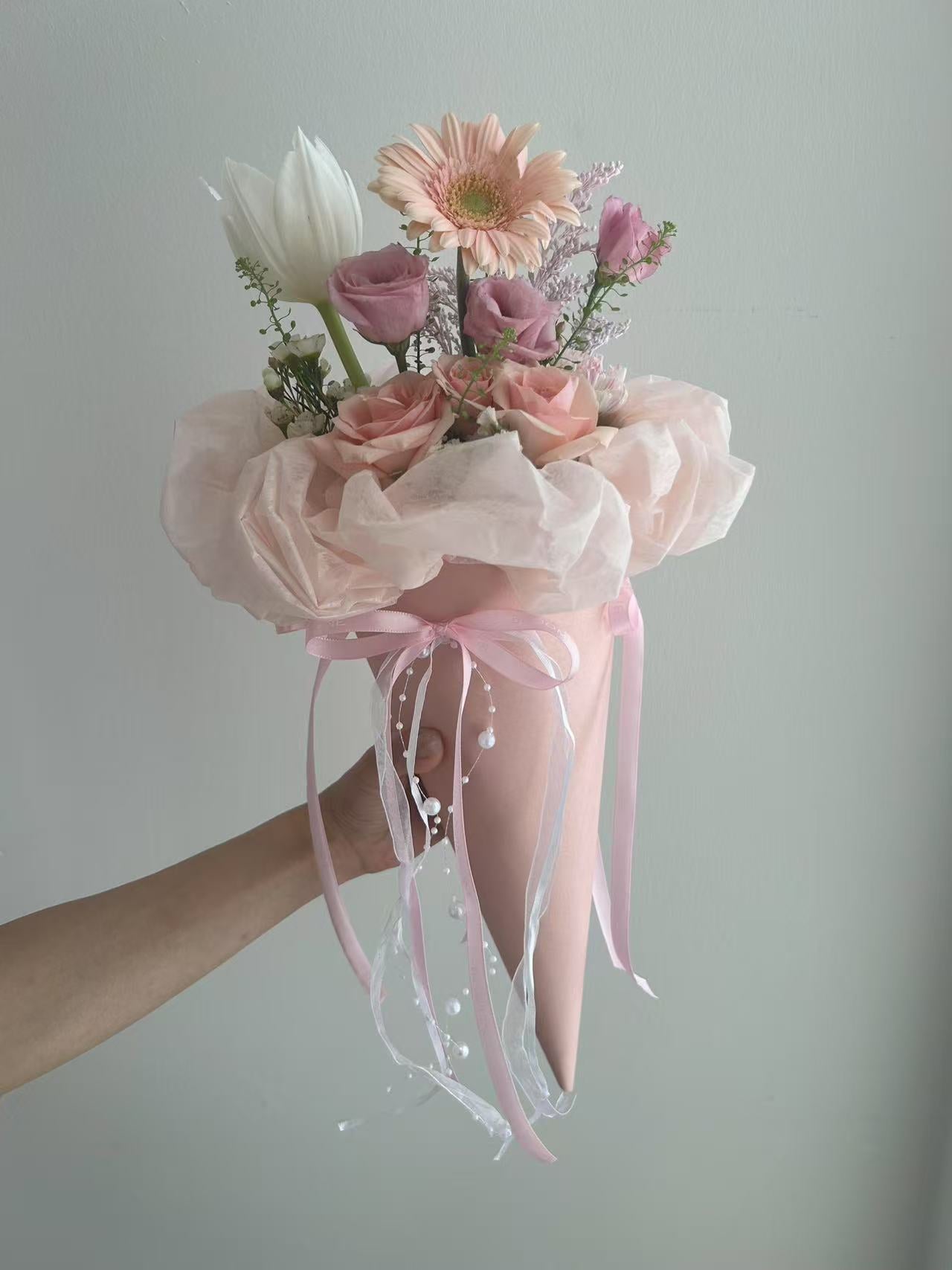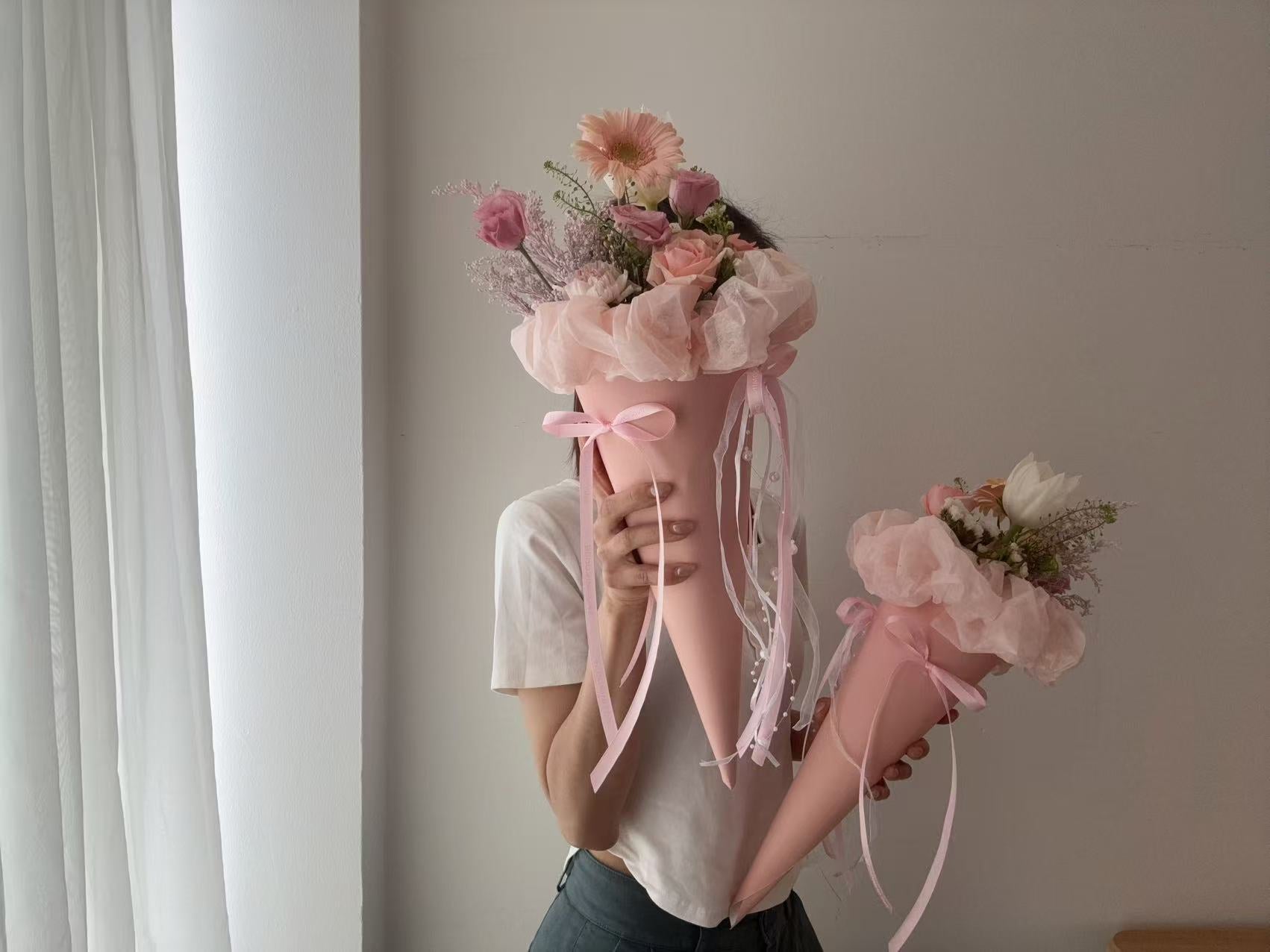 蜜桃马卡龙雪糕筒花束,将温暖的蜜桃色与柔美的玫瑰、桔梗、郁金香巧妙结合,灵感源自甜蜜的马卡龙色系。无论是婚礼、生日还是浪漫约会,都能让现场洋溢幸福甜味。采用高级蜜桃色雾面包装,配上飘逸丝带,每一眼都怦然心动。
