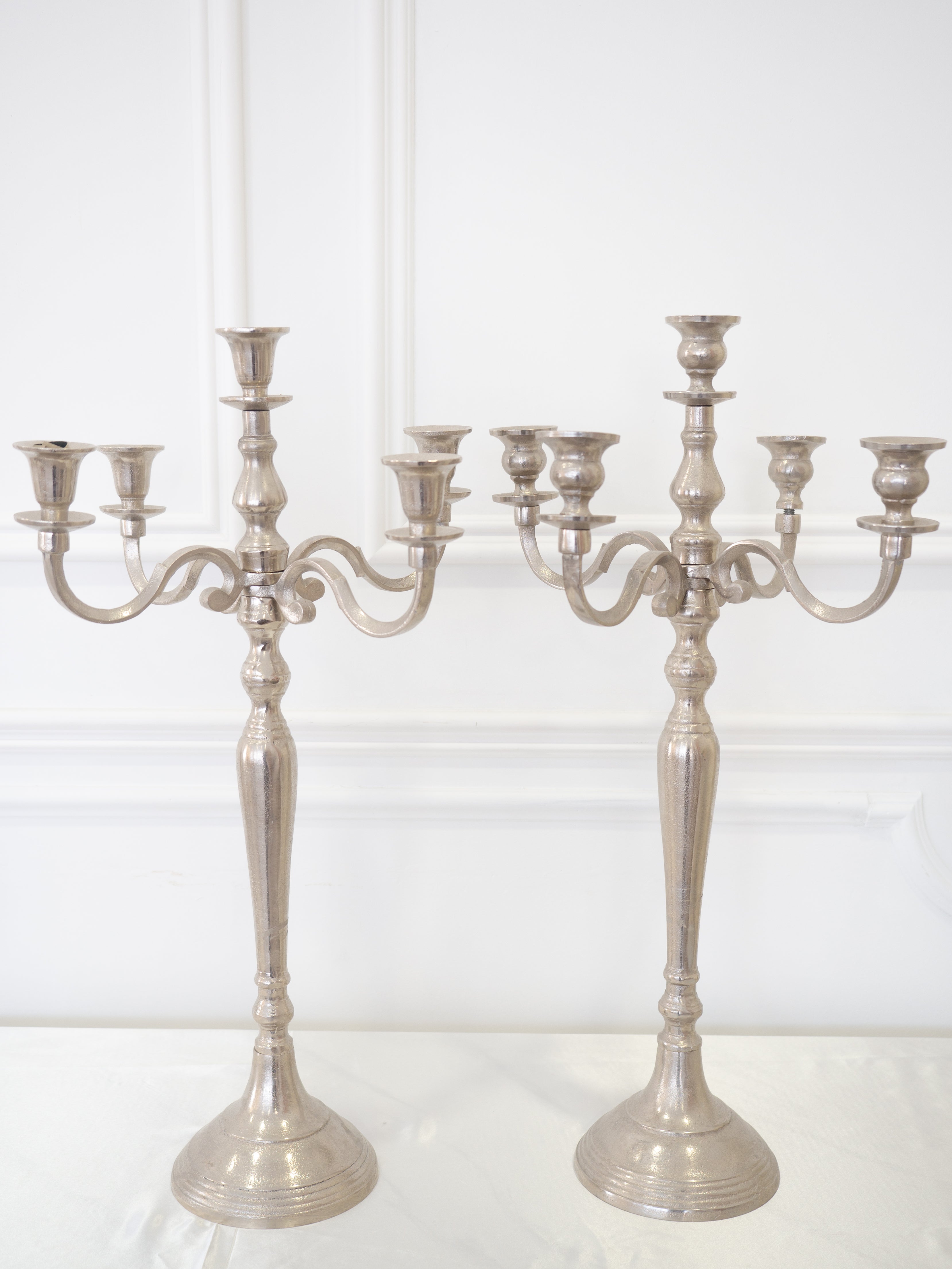 Elevate any event with our vintage silver candelabra, featuring five elegant arms perfect for taper candles. Its tall, sculpted form adds a touch of timeless sophistication, making it the ideal statement piece for weddings, galas, or editorial shoots.