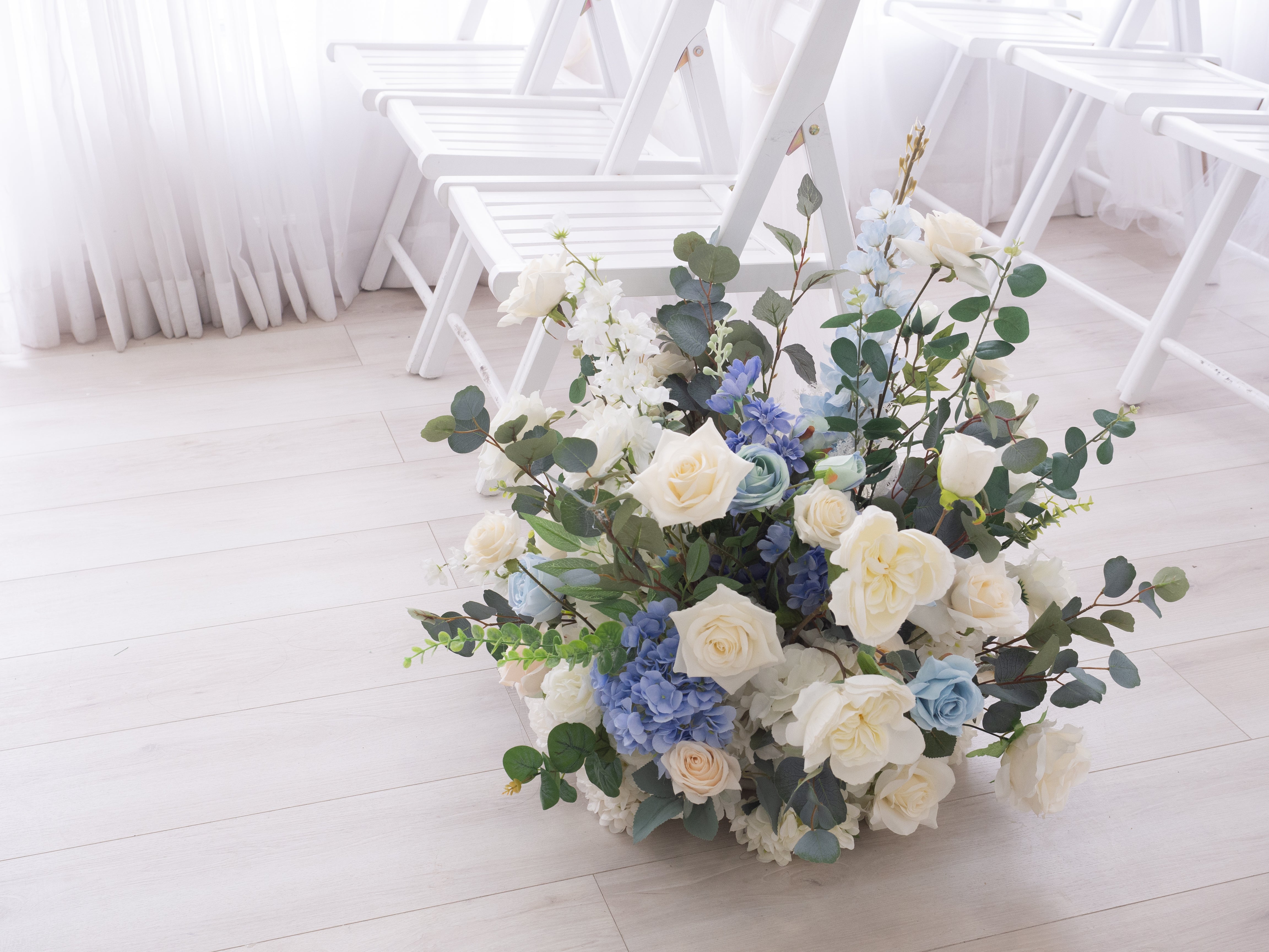 Faux Centrepiece (22 inches) Classic Garden White with Light Blue Rental - 绢花桌花22寸经典白绿蓝租赁