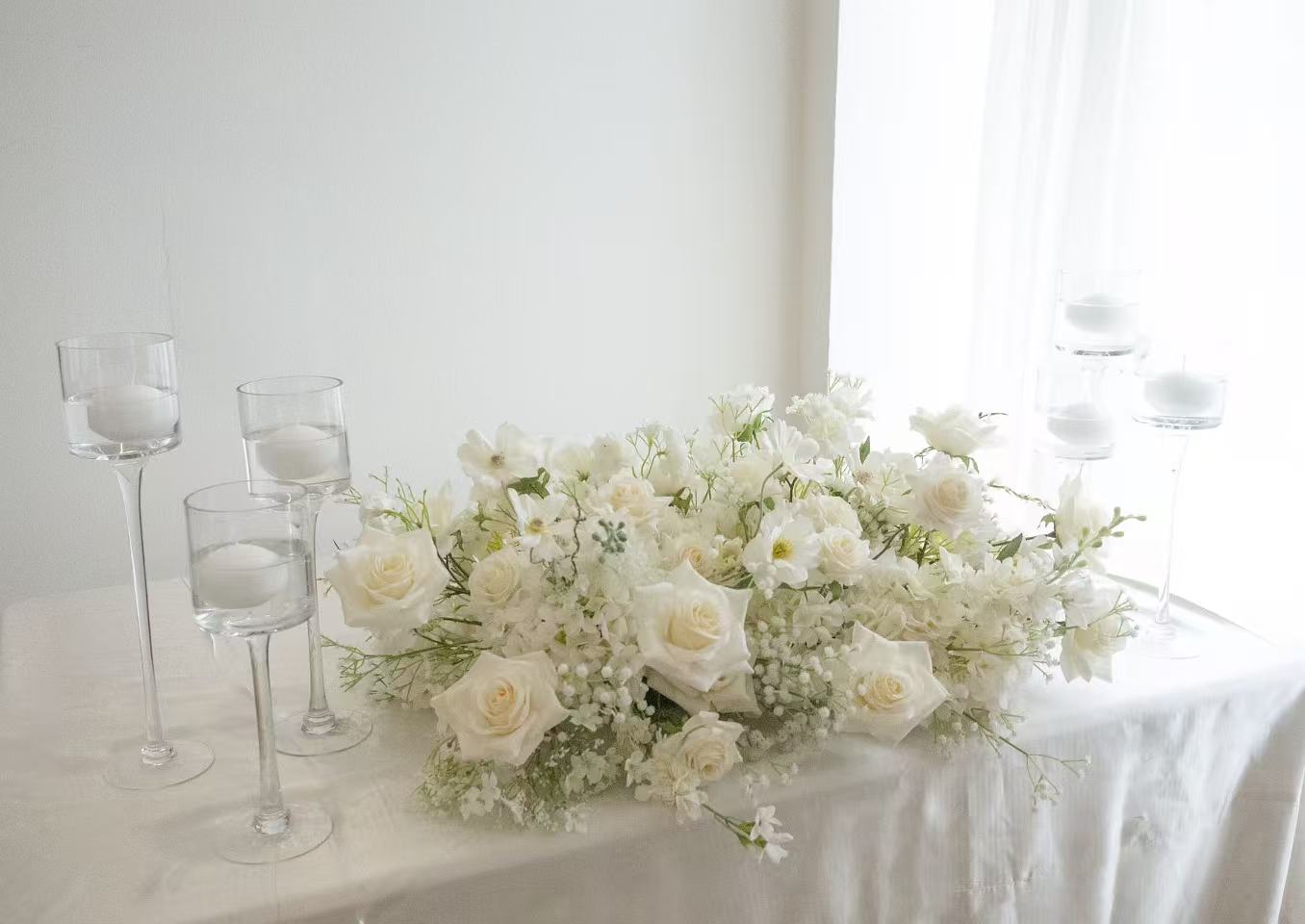 这款纯白色系丝花主桌布置,由高仿真玫瑰与绣球花手工打造,搭配绿叶点缀,呈现极简却不失高级的氛围。适合婚礼、白色主题派对或品牌活动使用,租赁形式经济环保,布置便捷,无需担心花材凋谢,适合高品质视觉呈现。