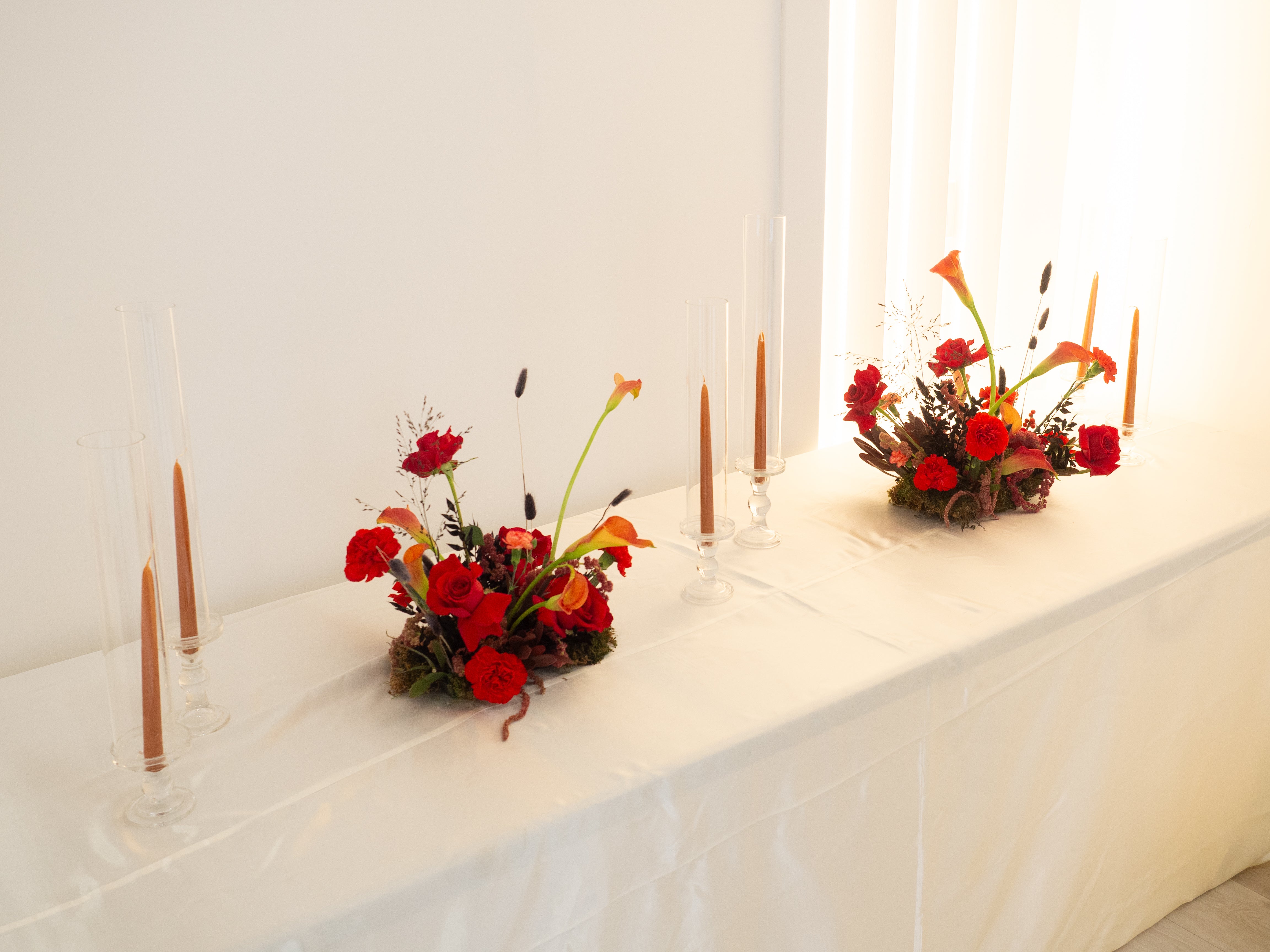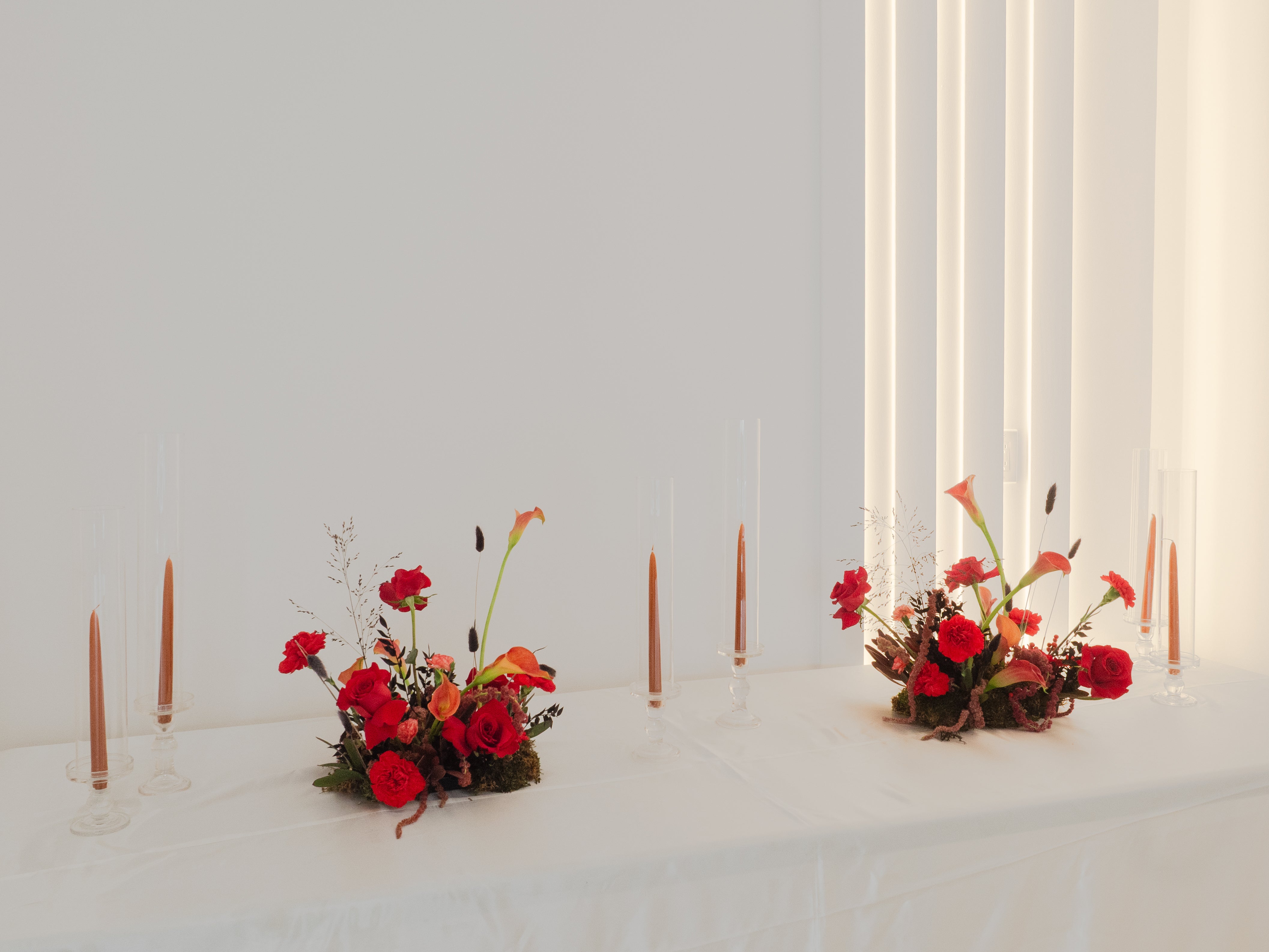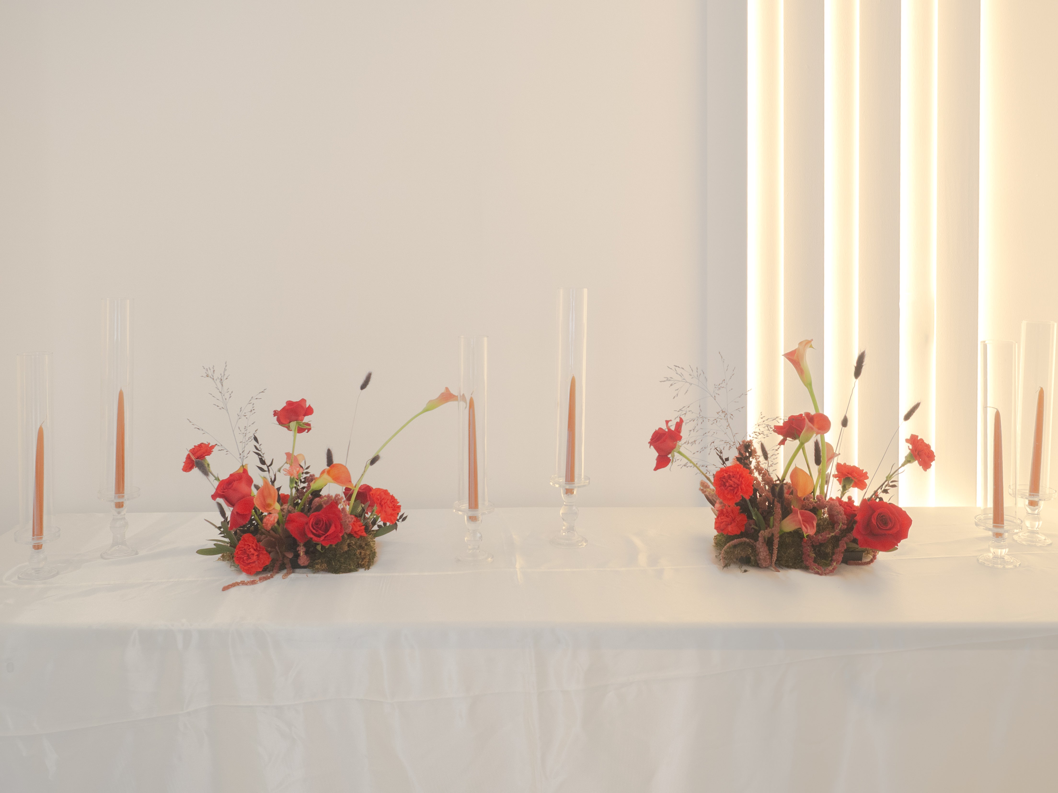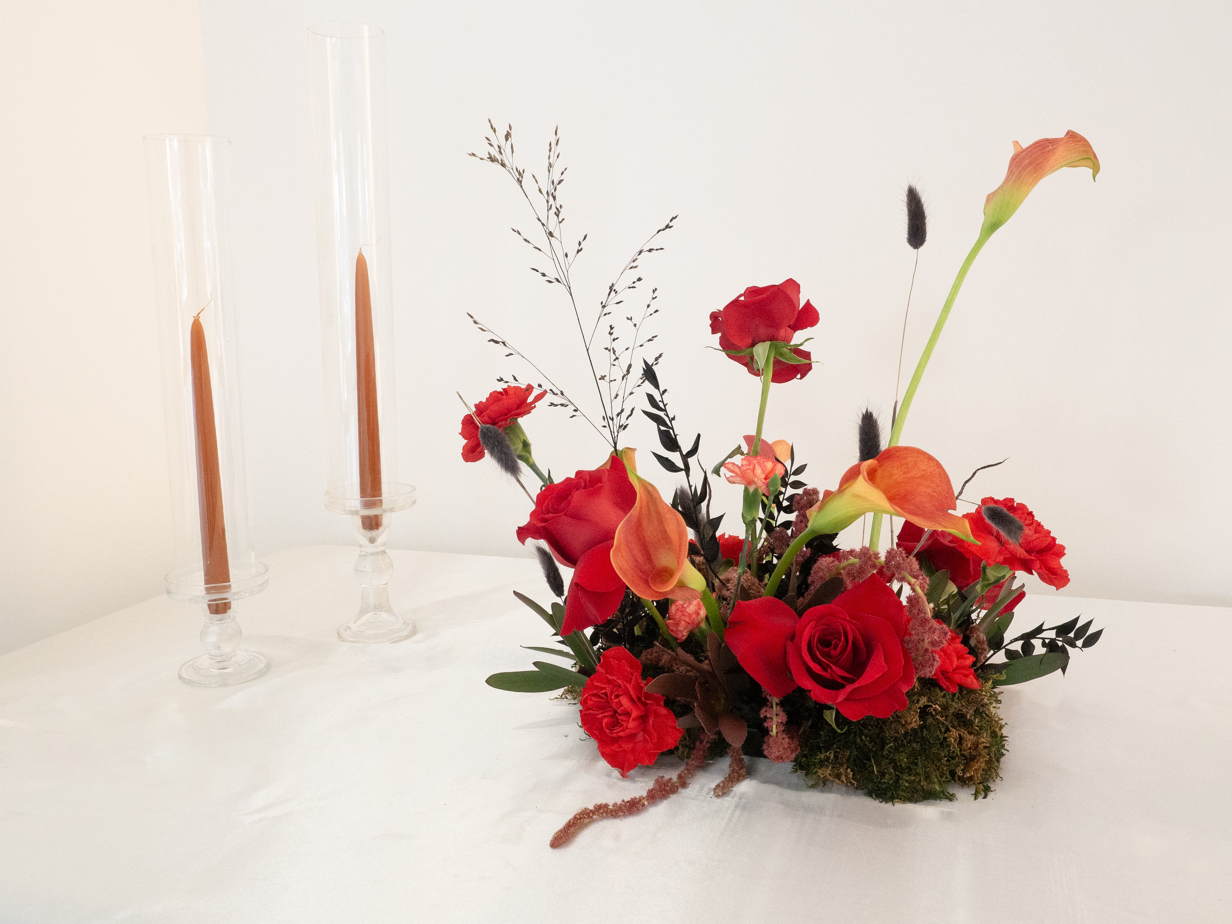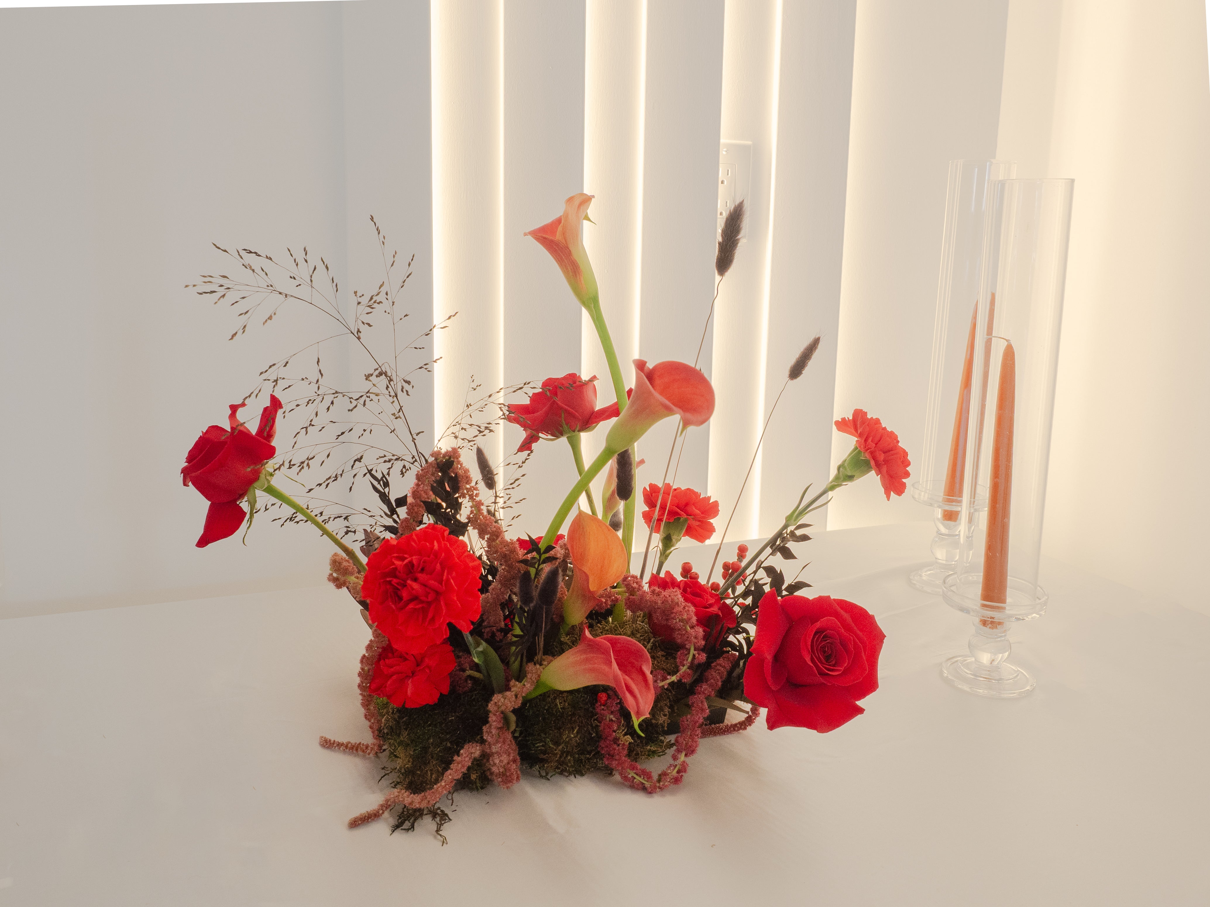 This bold centerpiece features fiery calla lilies, lush red roses, and textured wild elements, all brought together in an organic, low-profile composition. Perfect for intimate weddings, romantic dinners, or styled shoots, it speaks of passion, elegance, and modern naturalism.