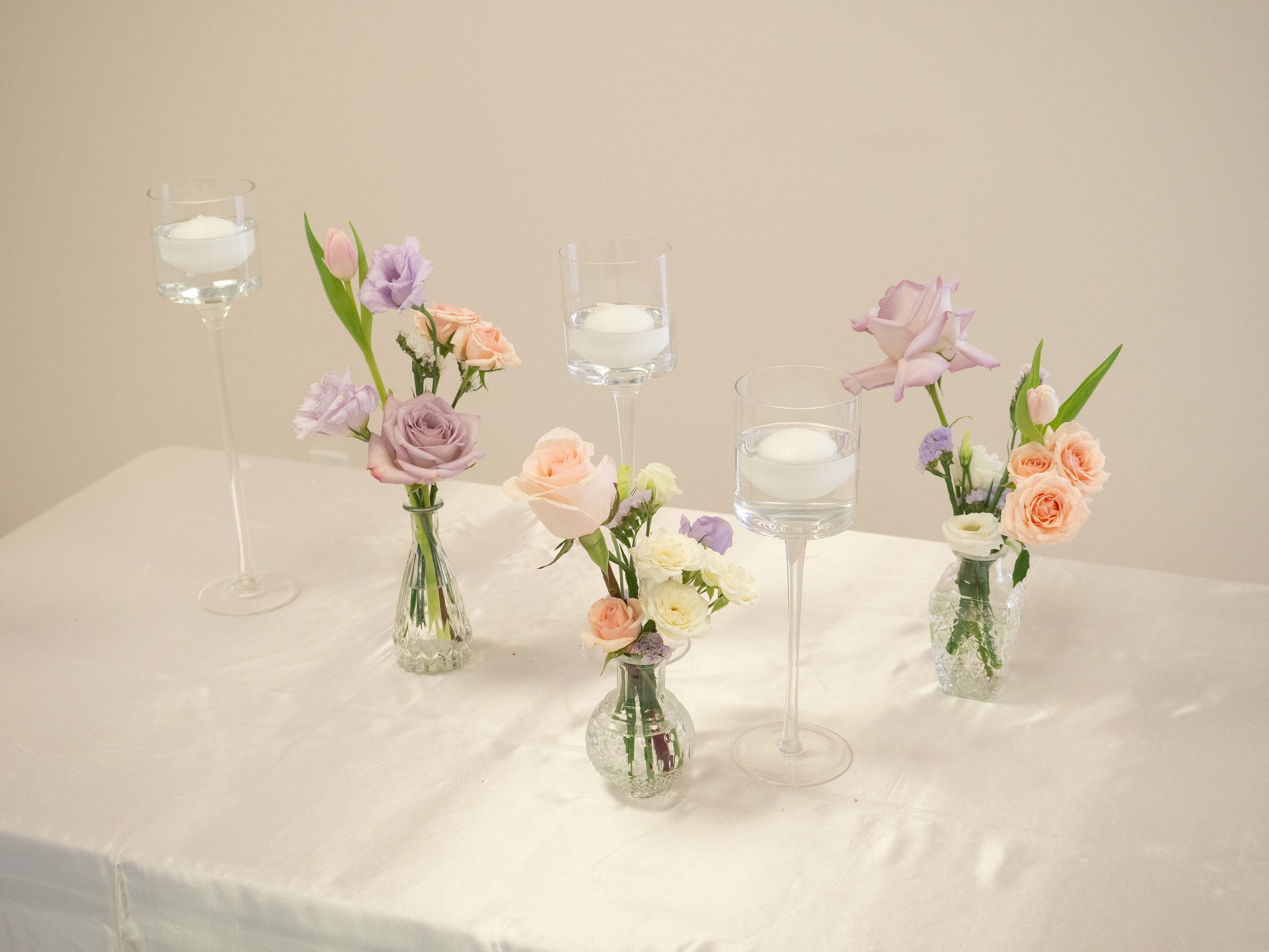 这组桌花用淡紫、蜜桃、粉色与奶油白交织出春日般的梦幻配色。每一瓶都像自然花园里摘下的轻盈花束,搭配简洁玻璃瓶,既浪漫又有灵动感。特别适合春日婚礼、Bridal Shower 或充满生命力的活动布置。