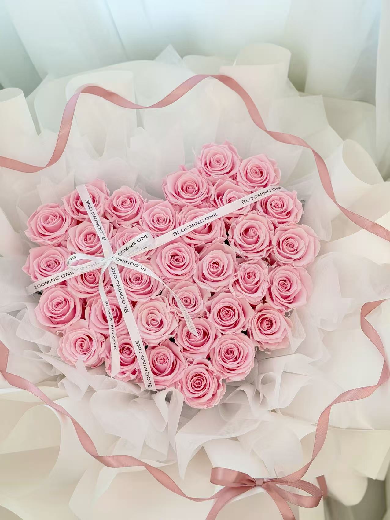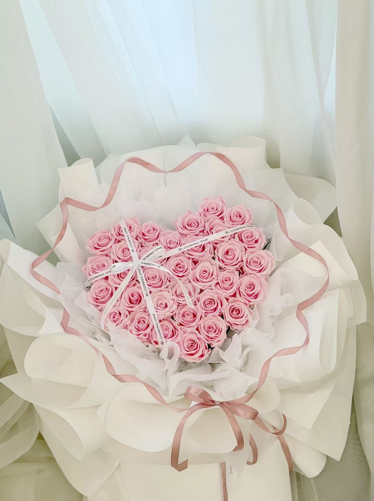 精选高品质粉色玫瑰,精致排布成爱心造型,搭配高级奶油白欧根纱与丝带点缀,整体柔美又高级。这款花束象征纯粹与浪漫,非常适合纪念日、求婚、生日、婚礼伴手花或婚礼摄影使用。层层包裹呈现饱满立体的爱心轮廓,一眼心动,温柔告白。
