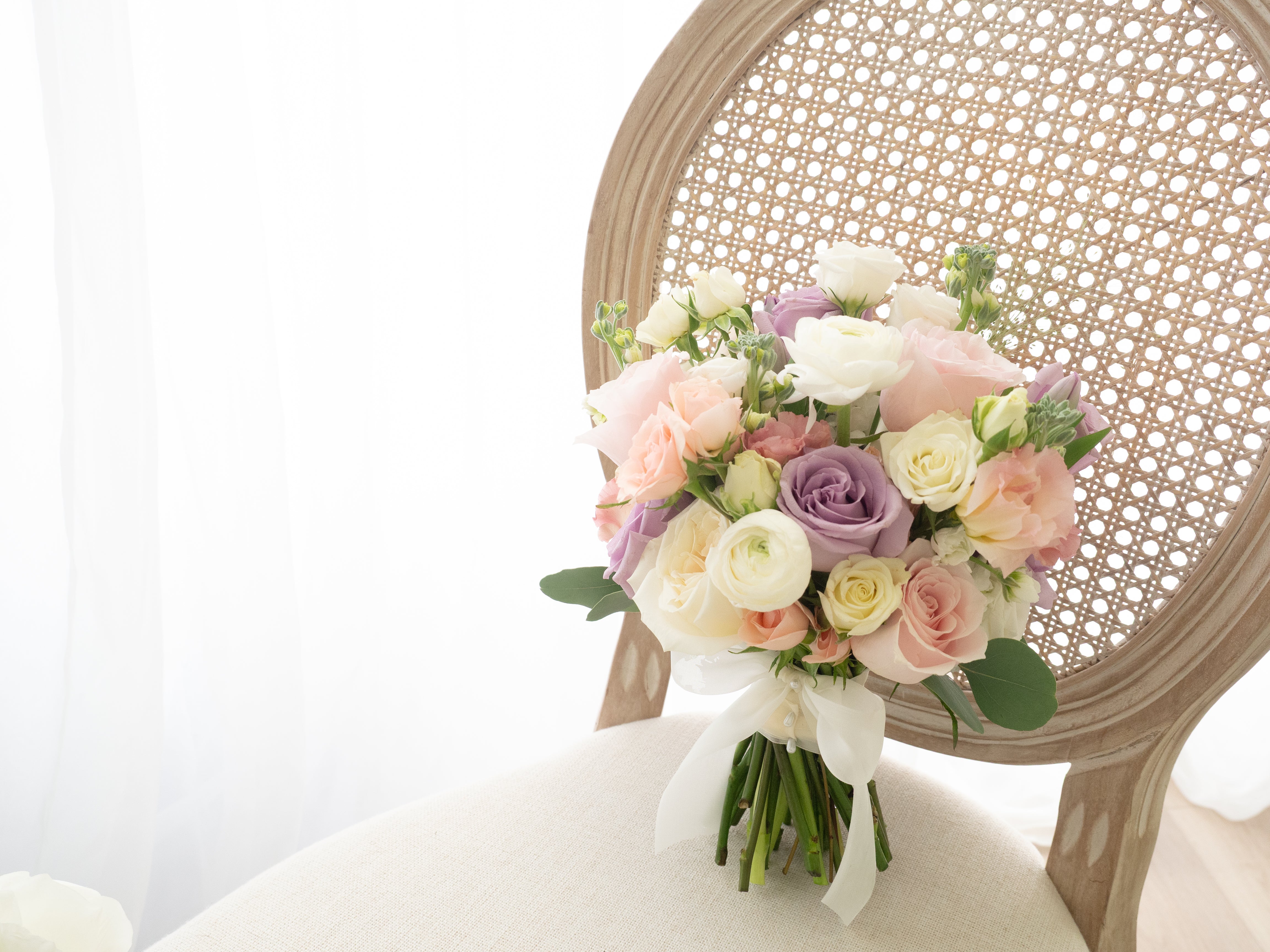 It is a sweet hand-tied bouquet that brings together pastel roses, ranunculus, lisianthus, and eucalyptus. Each flower feels like a dot of romance falling gently into place, creating a dreamy palette of lavender, blush, ivory and peach. This bouquet is perfect for weddings, engagements, couple shoots, and anyone who adores gentle romance.