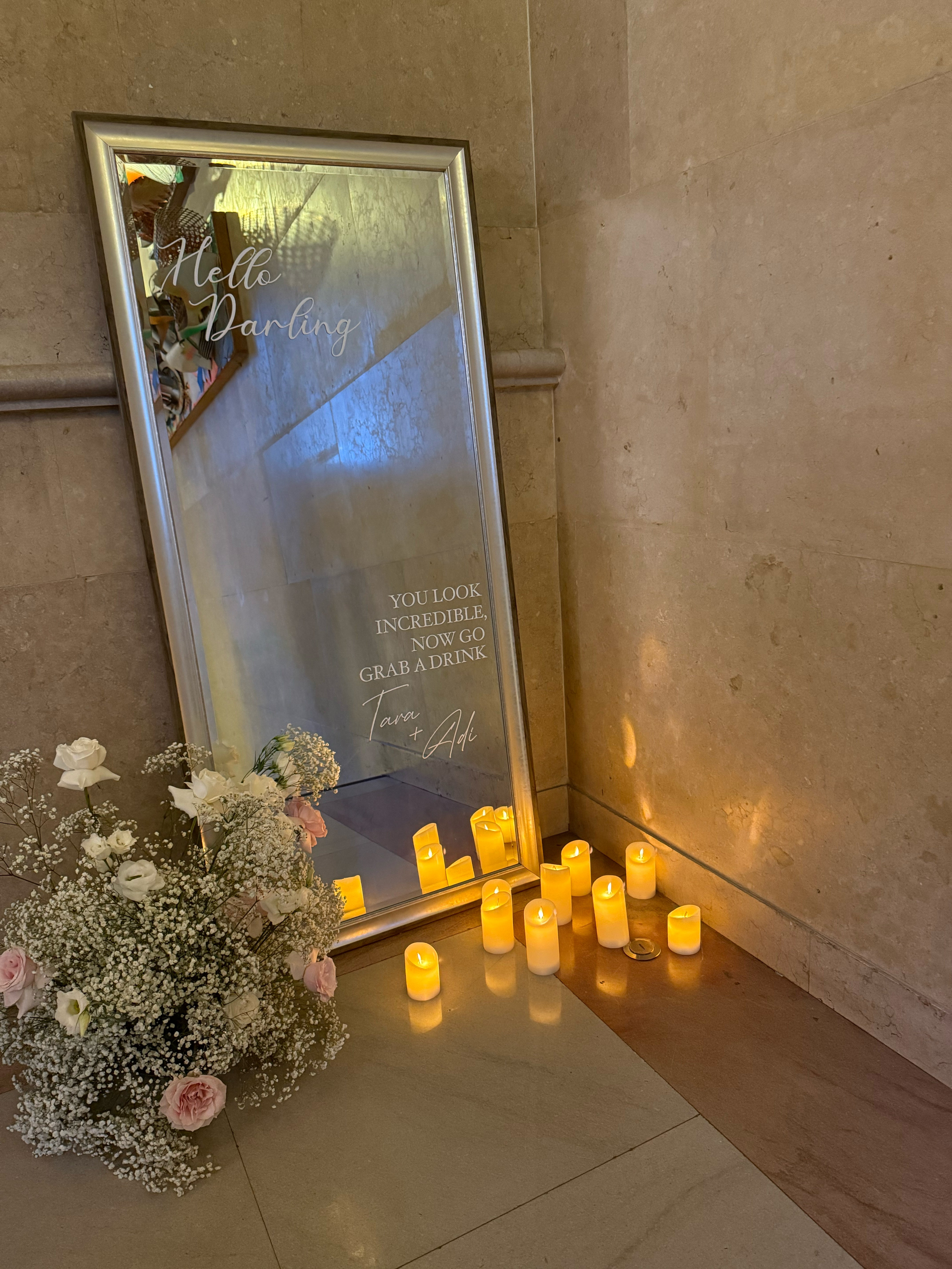 — 在30x70英寸镜子的基础上,增加定制文字,并搭配高仿真丝花装饰与氛围感LED蜡烛,适用于婚礼迎宾区、打卡区,营造梦幻浪漫氛围。