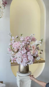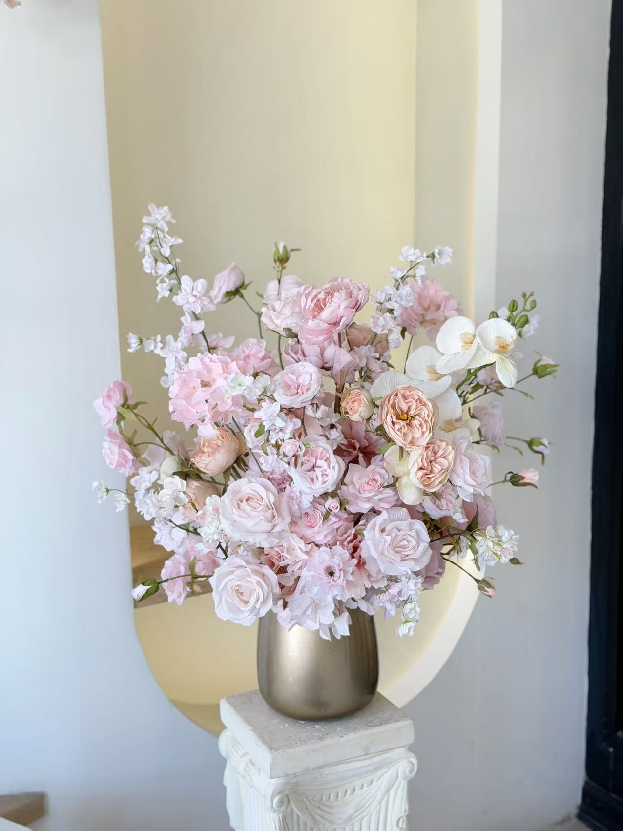 부드러운 블러시 톤에 겹겹이 쌓인 정원 장미, 섬세한 꽃잎, 그리고 우아한 난초로 디자인된 이 실크 꽃꽂이 장식은 어떤 공간에도 따뜻함, 우아함, 그리고 풍요로움을 선사합니다.