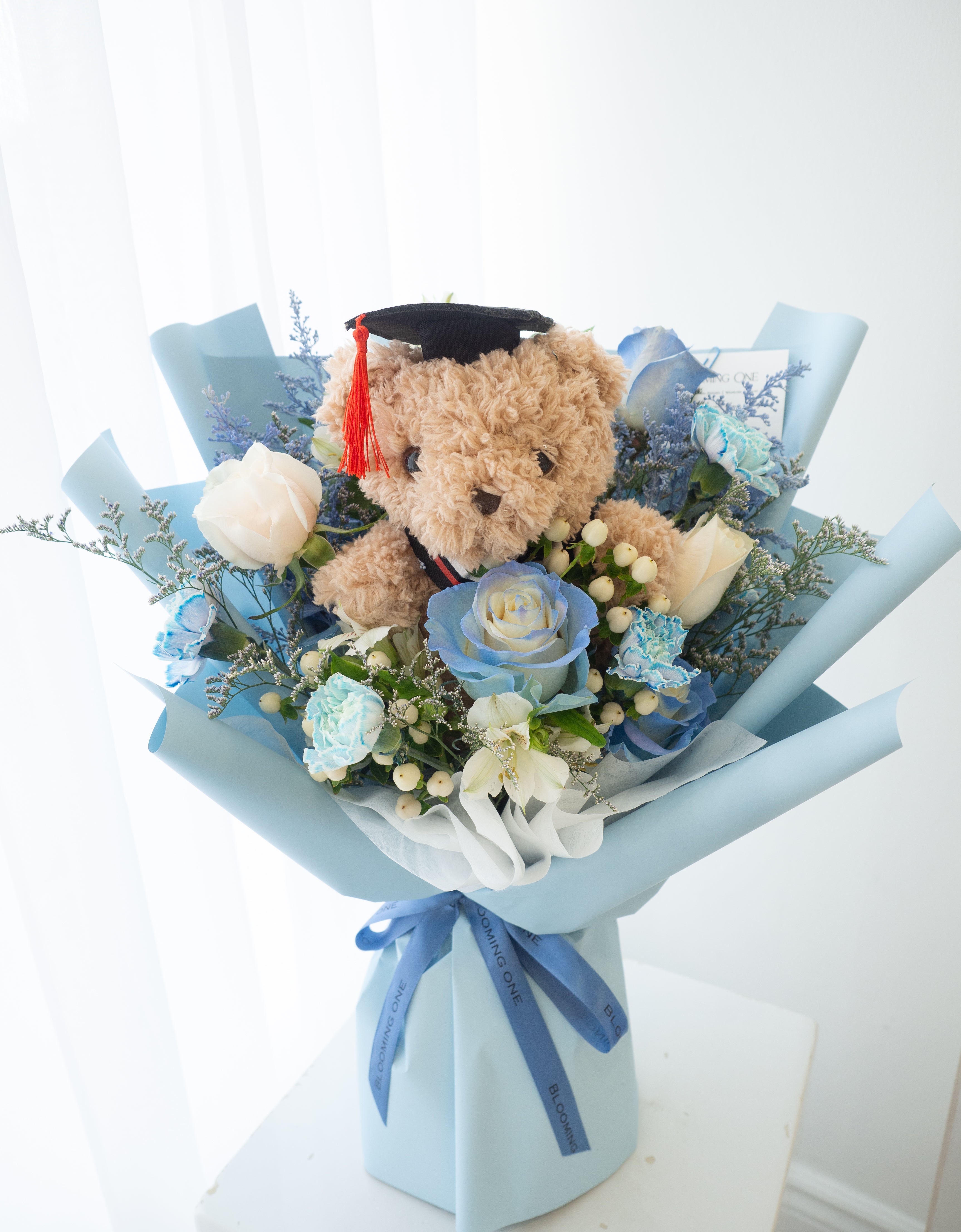 这款专为毕业季打造的花束,采用蓝玫瑰、白玫瑰、满天星与白果实点缀,搭配一只戴着学士帽的小熊,寓意温柔守护与美好祝福。蓝白配色清新典雅,既是送给毕业生的诚挚鼓励,也是记录成长的重要时刻。
