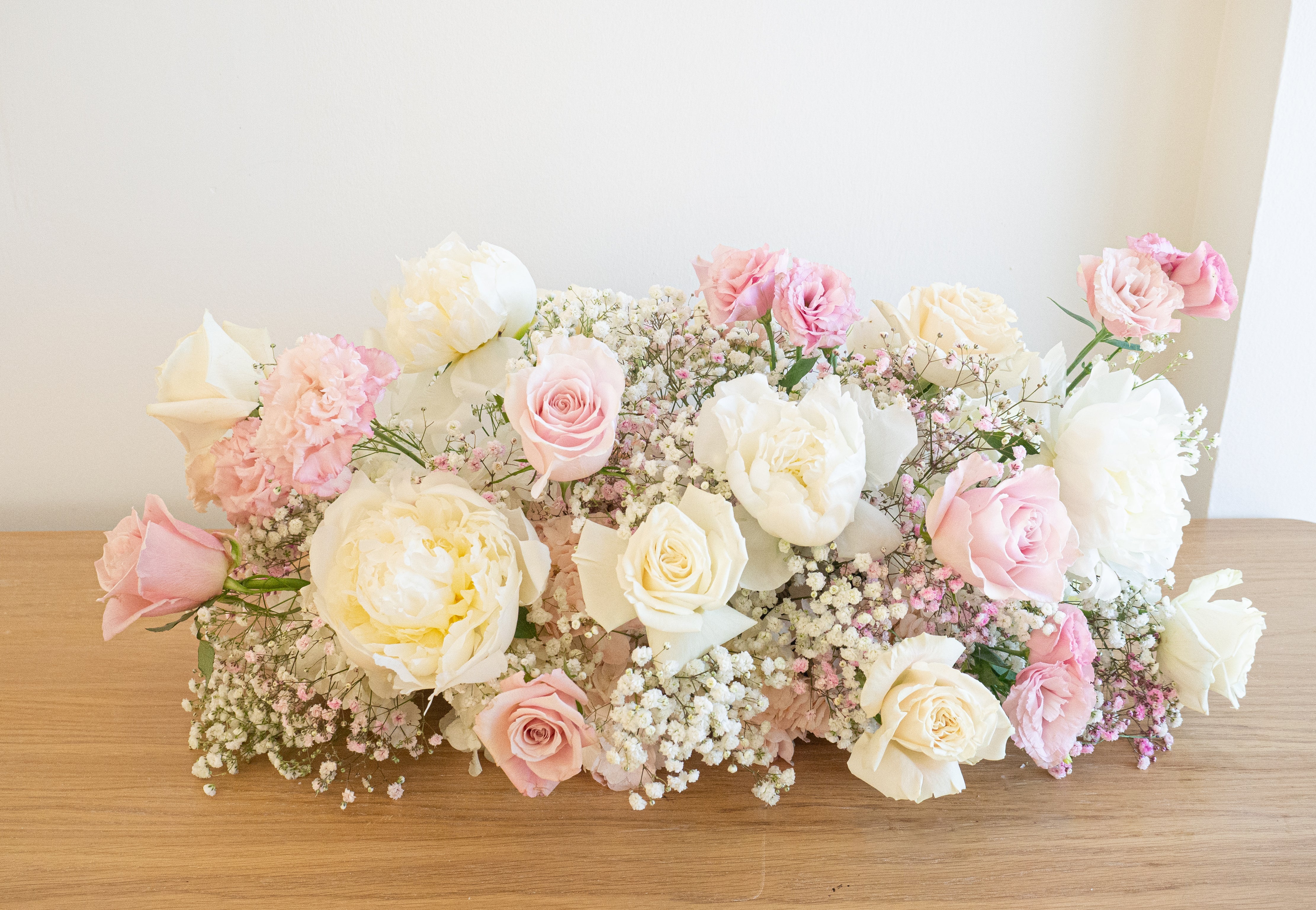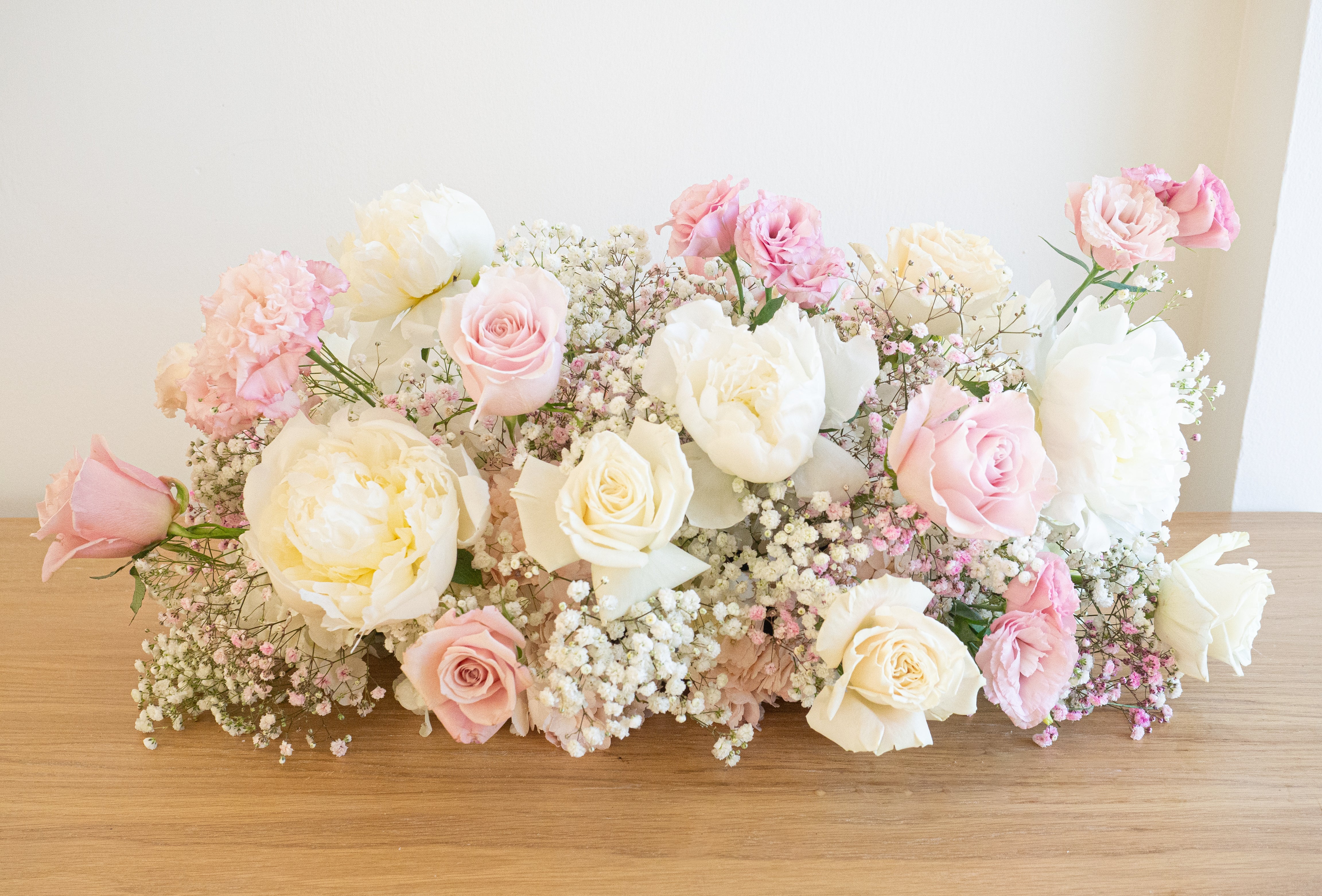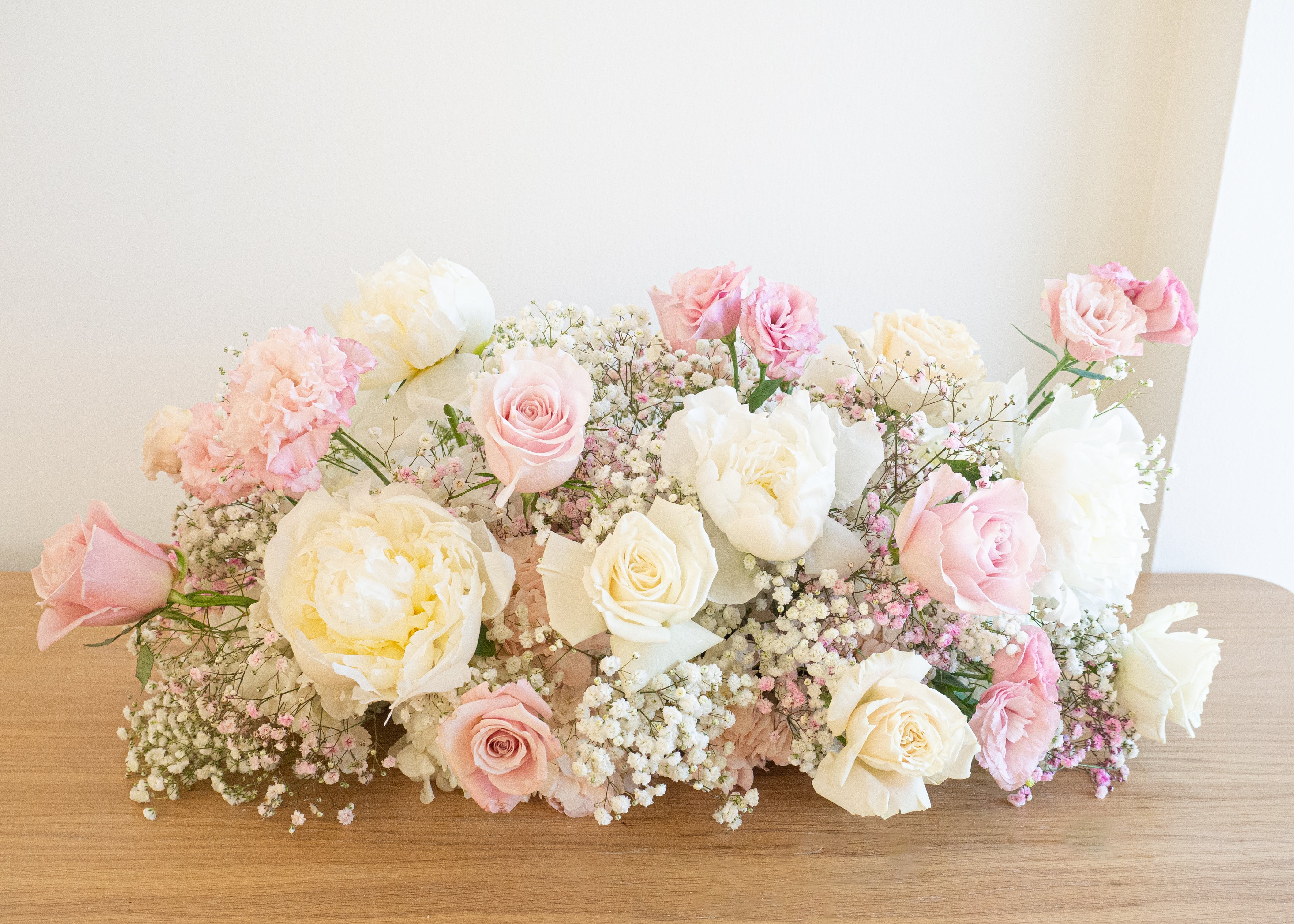 这款24寸长桌花以柔粉玫瑰、白芍药、康乃馨和满天星组成,层次丰富而不张扬,是主桌、迎宾台、甜品台或拍照布景的理想之选。清新柔和的配色与低矮布局既唯美又实用。