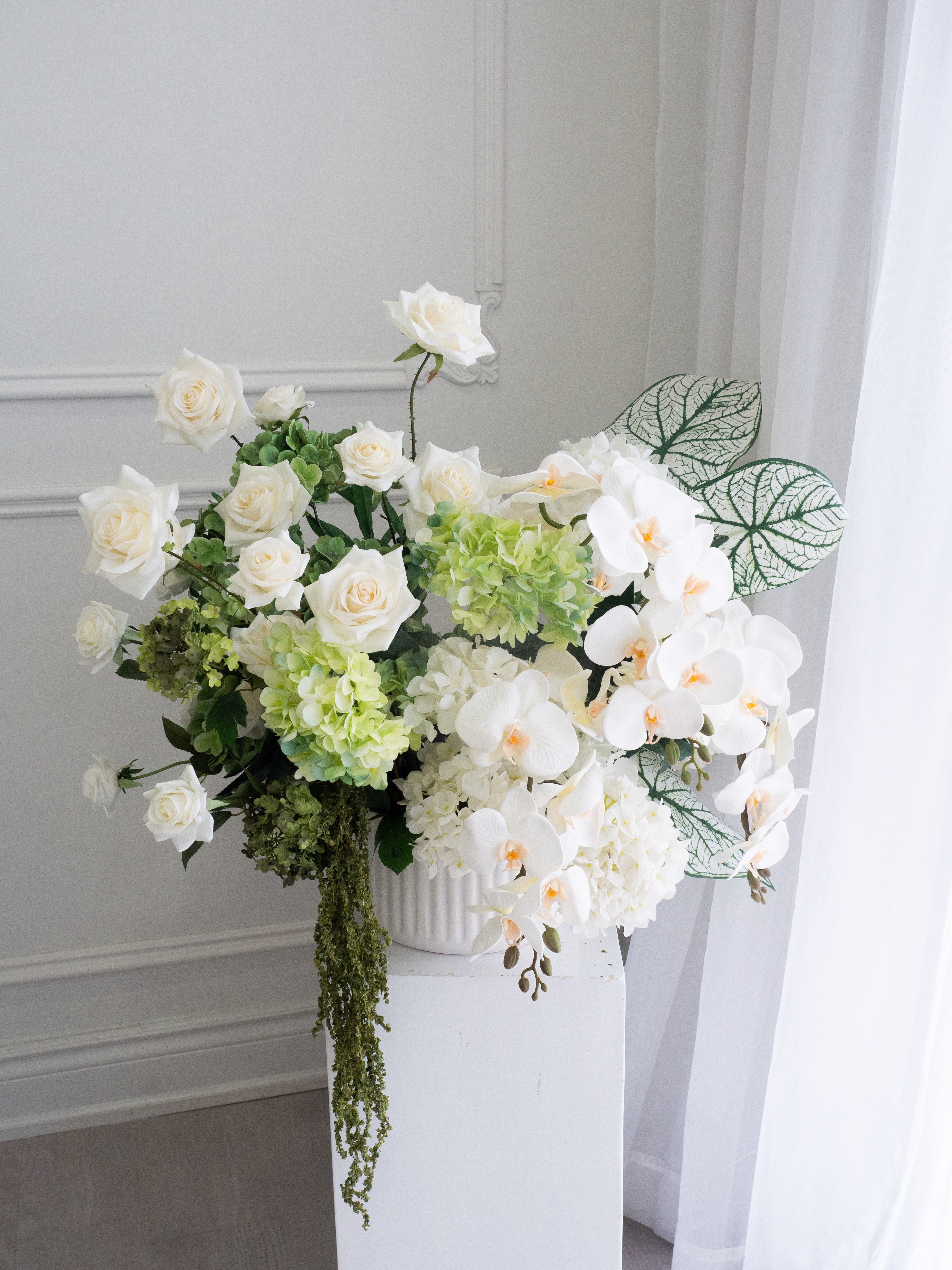 A modern botanical arrangement featuring white orchids, ivory roses, and soft green hydrangeas with cascading greens. This natural yet luxurious composition brings a refreshing touch of elegance — perfect for wedding decor, photo shoots, or upscale venues seeking quiet sophistication.