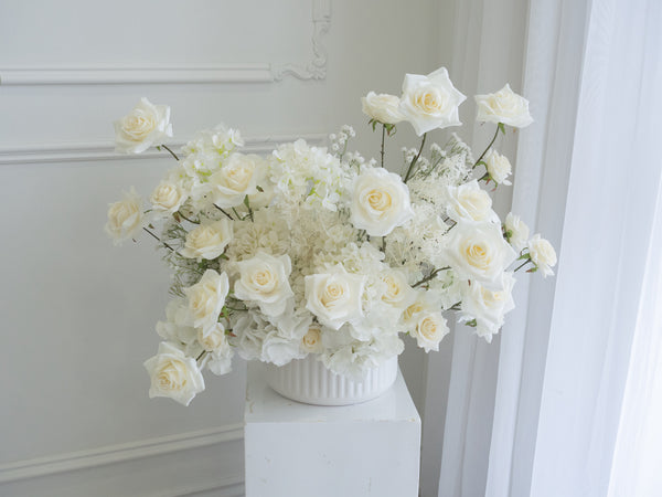 A timeless arrangement that exudes elegance and serenity, featuring premium ivory roses, snow-white hydrangeas, and airy baby's breath. Ideal for weddings, editorial shoots, or minimalist spaces where beauty whispers in calm tones.
