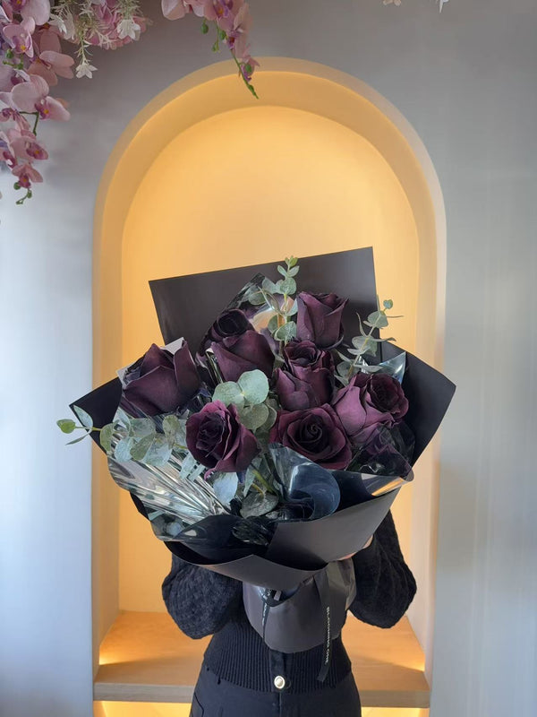 深紫玫瑰搭配烟灰叶材,包裹于极致黑的包装纸中,这款“午夜缪斯”自带气场,优雅又冷艳。适合酷感十足的送礼场景、纪念日惊喜或独具风格的派对布置。