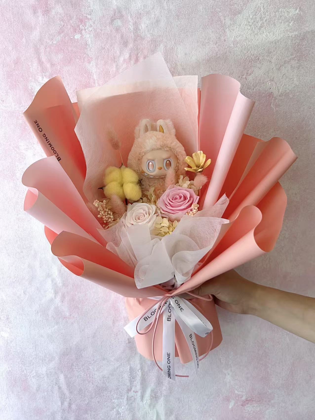 A soft and sunny Labubu bouquet in warm peach-pink tones. With pastel roses, fluffy accents, and a gentle Labubu plush, this piece radiates quiet joy – perfect for birthdays, friendship gifts, or “just because.”