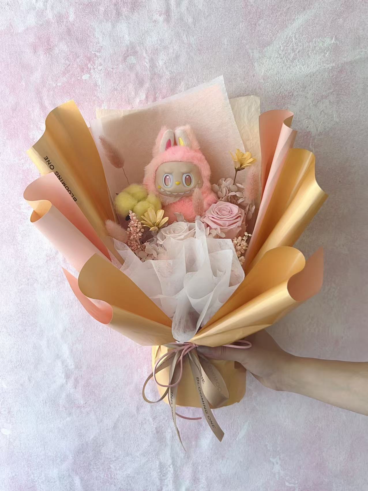 Bright and cheerful, this Labubu bouquet is wrapped in orange-gold tones with creamy roses and fluffy accents. A playful expression and soft bunny suit make this a sweet and funny surprise for any occasion.