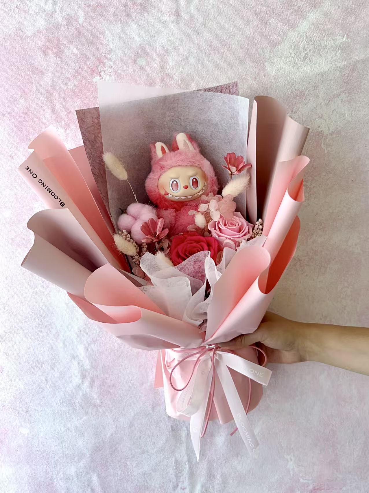 This pink Labubu bouquet is the definition of sweetness. With blush-toned preserved roses and fluffy accents, it's perfect for expressing gentle love and heartfelt moments.