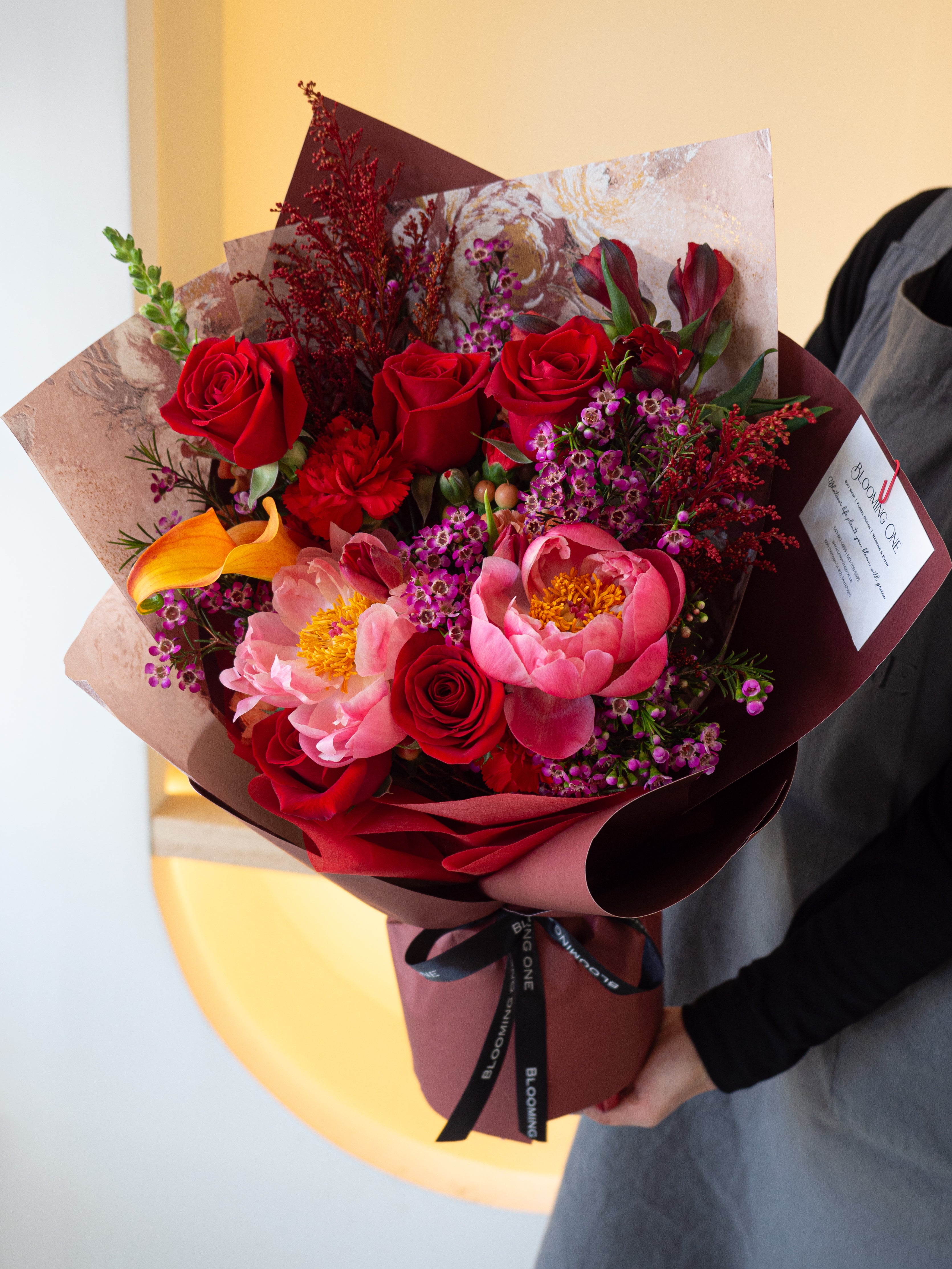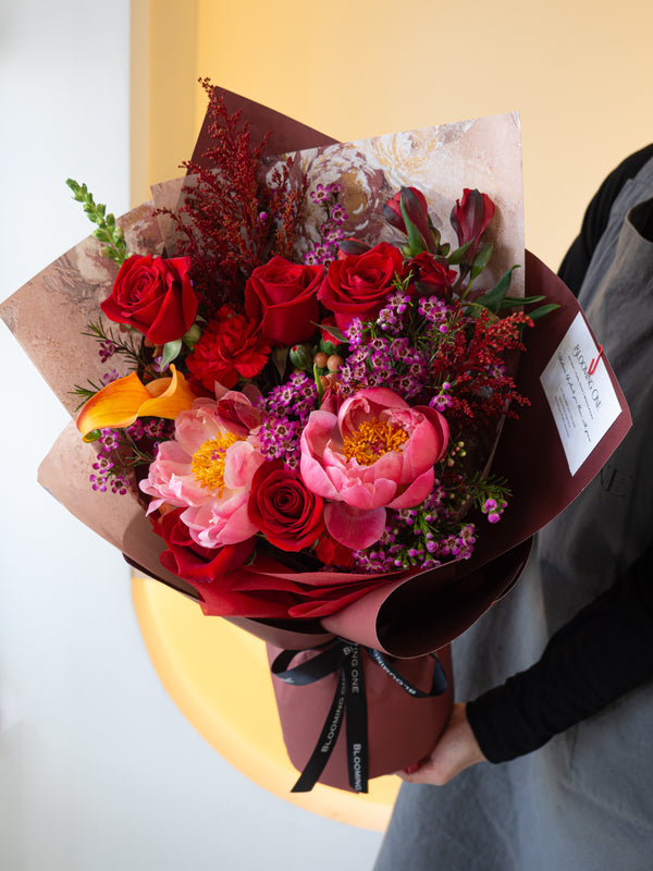 用“盛放的爱”花束,致敬母亲无私与坚韧的爱。鲜艳的玫瑰、娇嫩的牡丹花与应季花材巧妙搭配,色彩丰富饱满,传递出无尽的感激与深情。无论是母亲节还是任何想表达爱意的时刻,都完美契合。
