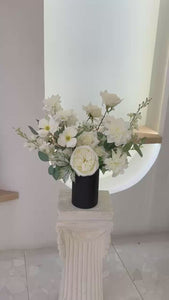 「纯白恩典」是一款永不过时的绢花设计,运用优雅白玫瑰、洋牡丹与轻柔点缀花材,搭配哑光黑花器,呈现极致的高级感与艺术感。全绢花材质,质感逼真且可长久保存,适合作为婚礼布置、拍摄造景或空间陈列。